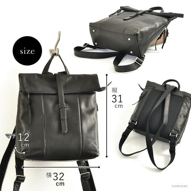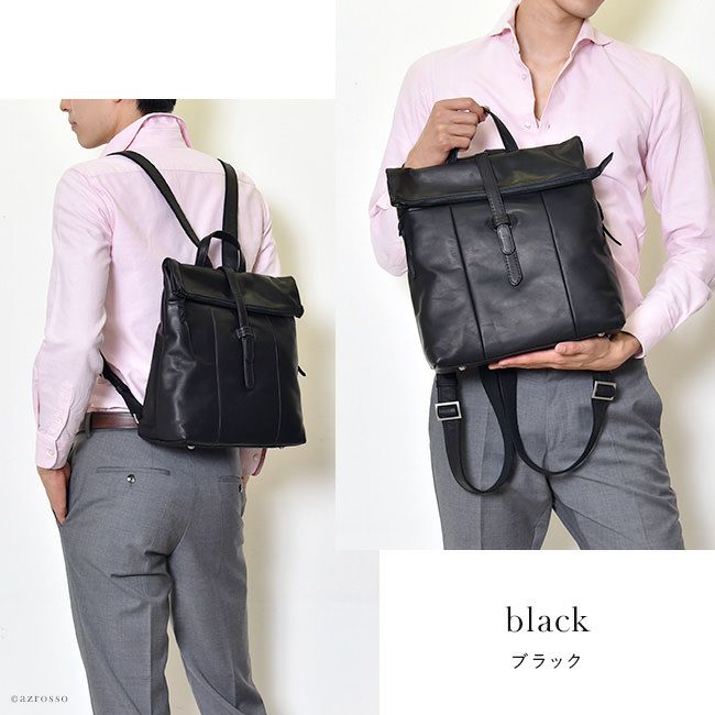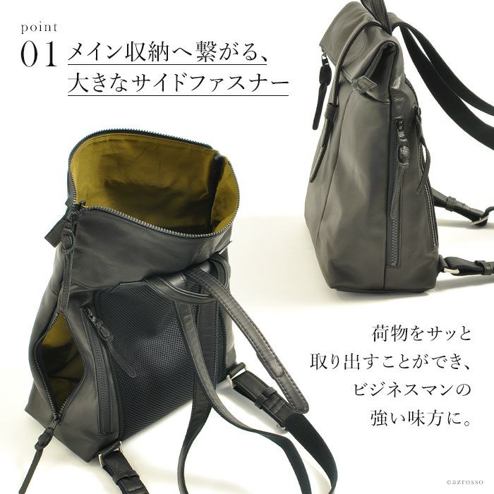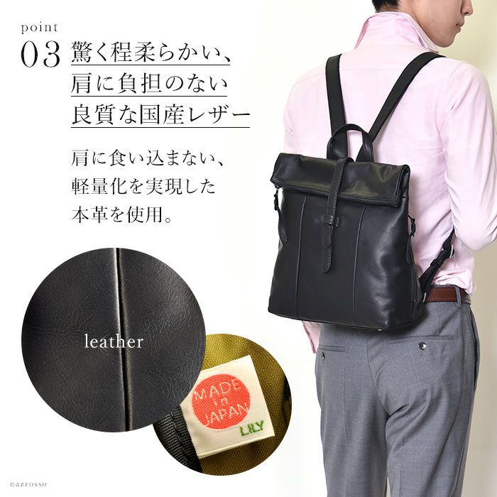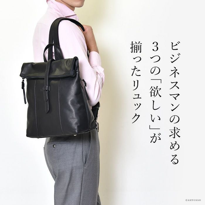 ビジネスマンの為のレザーリュック。肩に負担のない軽い&柔らかい国産本革を使用。仕事 自転車通勤におすすめ 軽量 レザー リュック メンズ 日本製 本革 ファスナー付きで使いやすい ブラック 黒