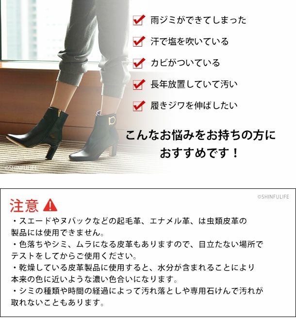 雨ジミができてしまった、汗で塩を吹いている、カビがついている、長年放置していて汚い。履きジワを伸ばしたい。こんなお悩みをお持ちの方に、お手軽に革靴のクリーニングを始められるシューズクリーニングセットがおすすめです。また、セット用品はミニサイズとなっていますので、シューズクリーニングのスターターセットとしてご購入されるのもいかがでしょうか。