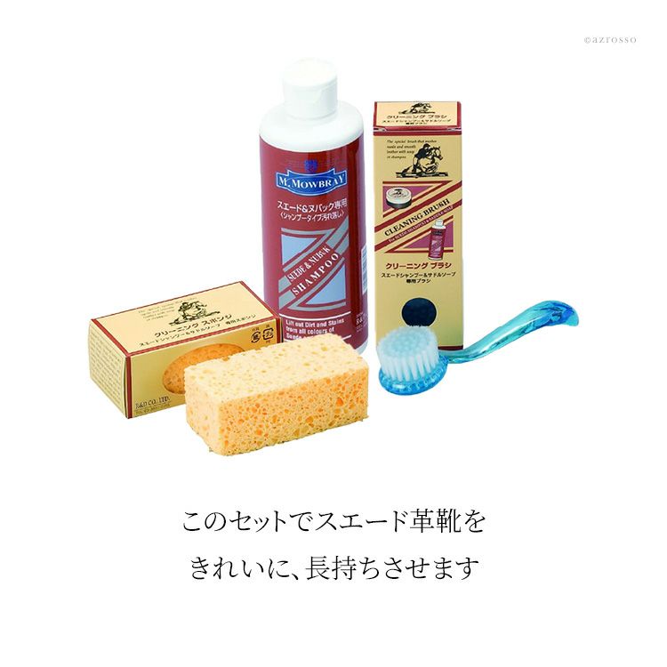 ヨーロッパで人気のシューケアブランド、M.MOWBRAY(モウブレイ)のスエードシャンプーにクリーニングブラシ、クリーニングスポンジをセットに。 モウブレイ スエードシャンプー スエード クリーナー 汚れ落とし ブラシ スポンジ 靴 スエード ヌバック 皮革 革靴 手入れセット M.モゥブレィ M.MOWBRAY お手入れ 革 スムースレザー クリーニング ケア