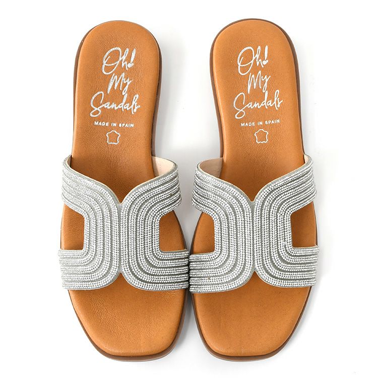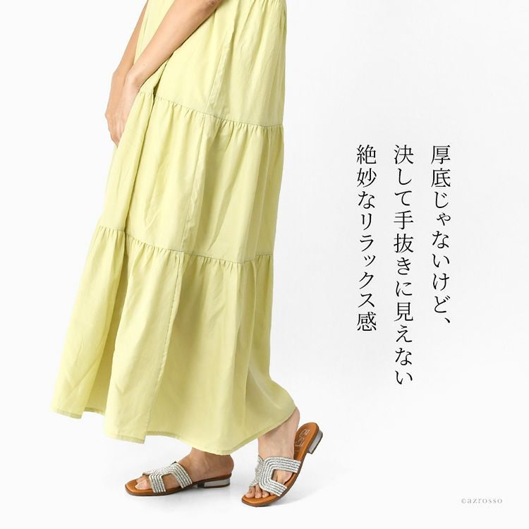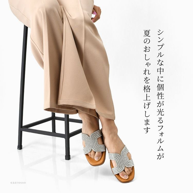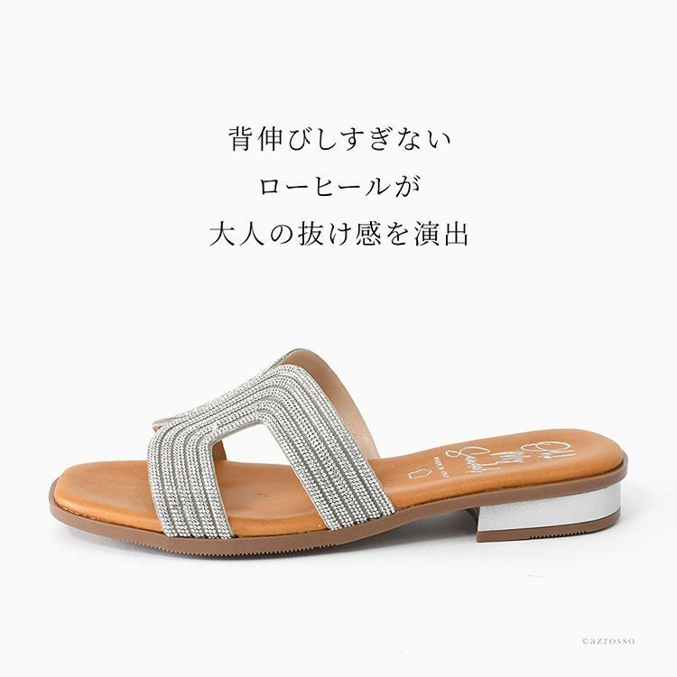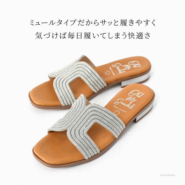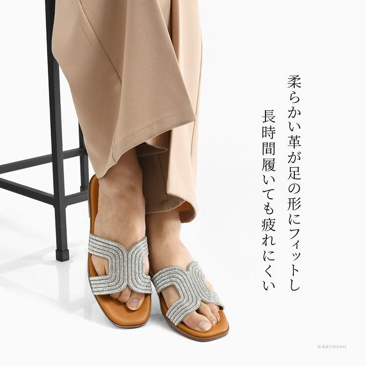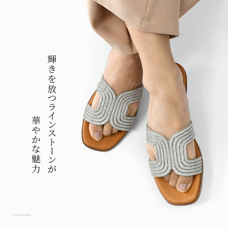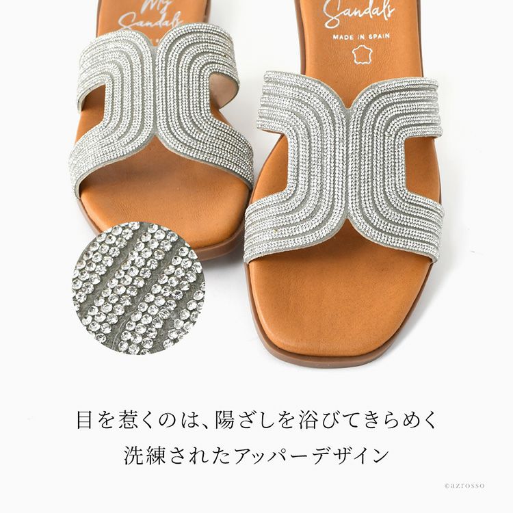 ▼特徴:ローヒールサンダル ラインストーン キラキラ サンダル ぺたんこ シューズ 靴 レザーサンダル 夏 歩きやすい 履きやすい 疲れにくい 痛くない スペイン ブランド つっかけ 高級 シルバー きれいめ 大きいサイズ 23cm 24cm 24.5cm 25cm 25.5cm スクエアトゥ ビジューサンダル