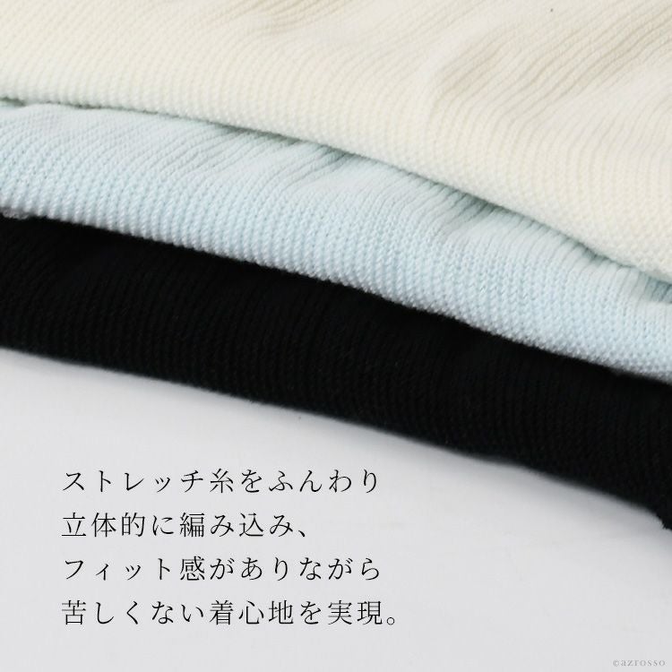 おなかをつつむ腹巻き部分は、肌に優しいコットン(綿)を使用。保温性だけではなく、吸湿性に優れているので、気温の変化が大きな春・高温多湿な夏・肌寒い秋とオールシーズン快適に過ごせます。 ストレッチ糸をふんわり立体的なワッフル編みで仕立てており、ウエストのくびれや丸みにしっかりフィットしつつ窮屈感なく苦しくない着心地を実現しました。 肌あたりが気になるタグは外側につけているのも嬉しいポイント。敏感肌の方にもストレスなく着て頂けます。