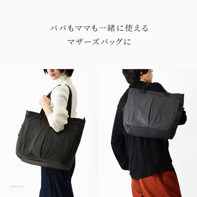 ヘルメットバッグ由来の機能性の高さと、充実した収納力、そして、何といってもオールブラックが普段使いしやすいデザイン性。トートバッグ&ショルダーバッグの2way仕様で、毎日を頑張るママ&パパを応援します。