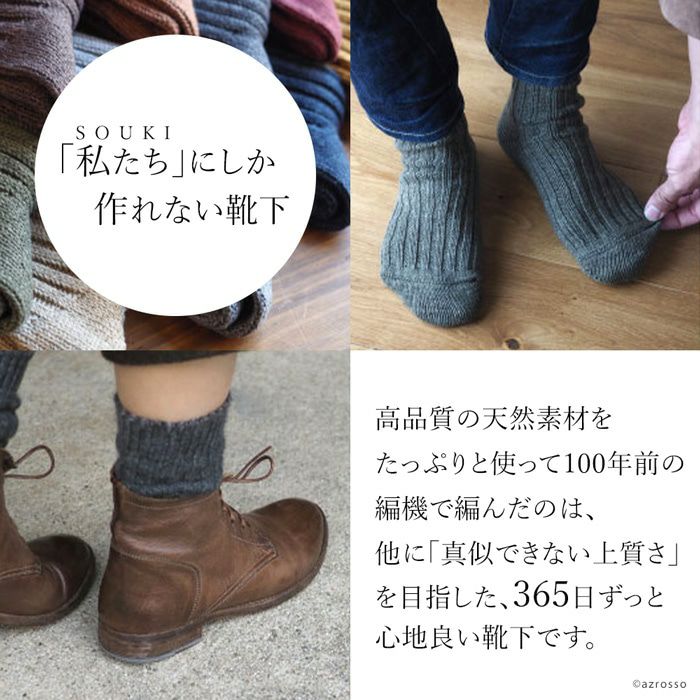そんな靴下のメッカで100年近く歴史を紡ぎ続けるソウキは、試行錯誤から成る進化を大切に、素材選びから最後の仕上げまで、アイテムに適した製法で一つ一つ丹精込めて仕立てているのが特徴。