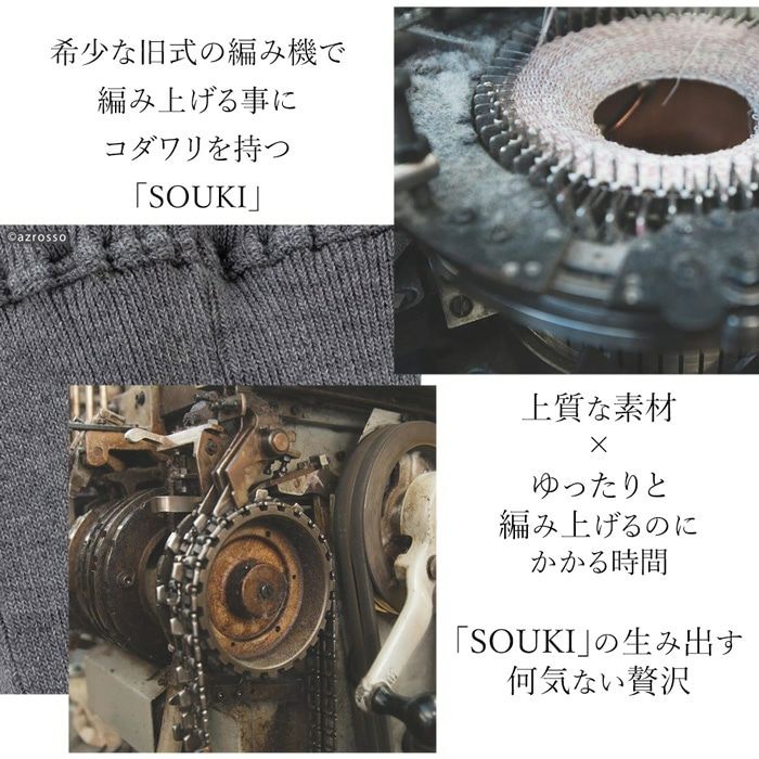 そんな靴下のメッカで100年近く歴史を紡ぎ続けるソウキは、試行錯誤から成る進化を大切に、素材選びから最後の仕上げまで、アイテムに適した製法で一つ一つ丹精込めて仕立てているのが特徴。