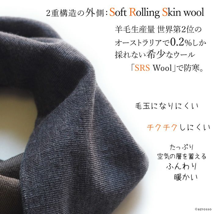 「Soft Rolling Skin wool/ソフトローリングスキンウール」略して「SRSウール」は、毛玉やピーリングができにくく、チクチク感が少ないだけでなく、ふんわり軽くて、とても暖かい極上のウールです。