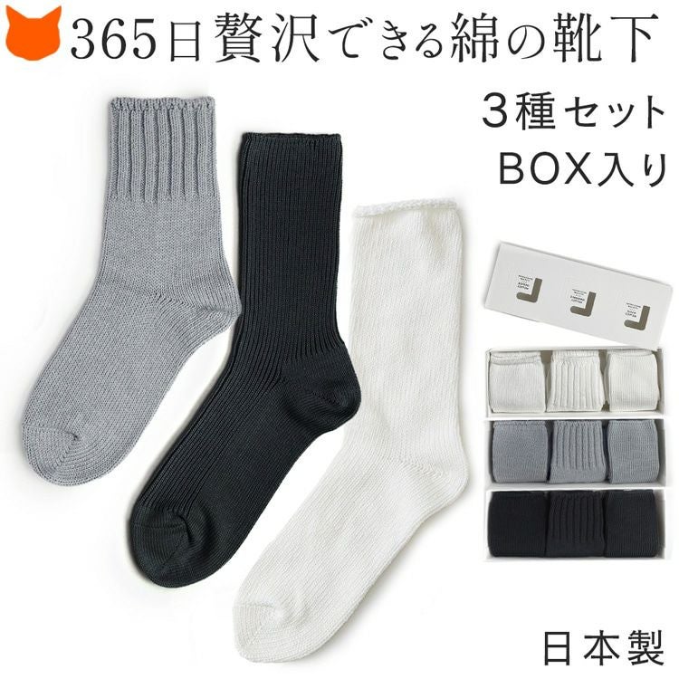靴下 3足 セット クルー丈 おしゃれ クルーソックス コットン ソックス 綿 くつ下 白 ホワイト グレー 黒 ブラック 22cm 23cm 24cm 25cm 26cm 27cm 日本製 リブソックス 無地 プレゼント 箱入り 箱付き 男女兼用