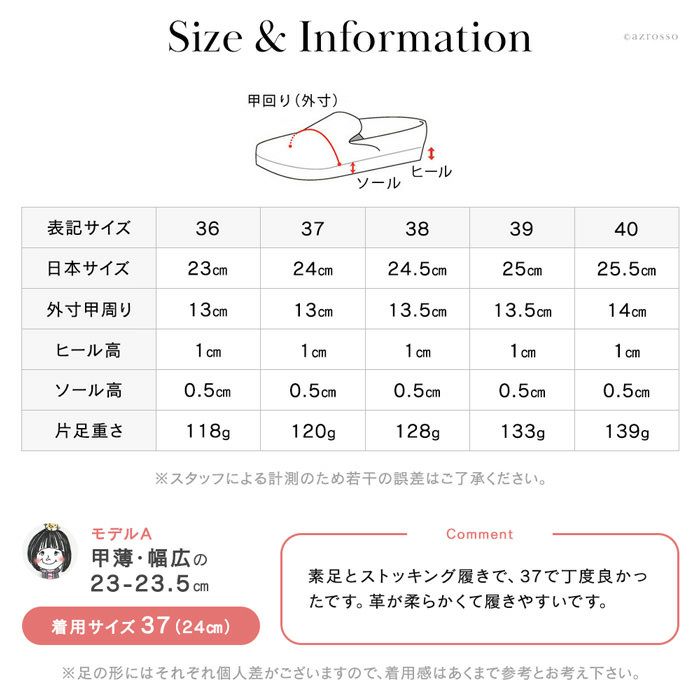 コメント:素足とストッキング履きで、37で丁度良かったです。革が柔らかくて履きやすいです。