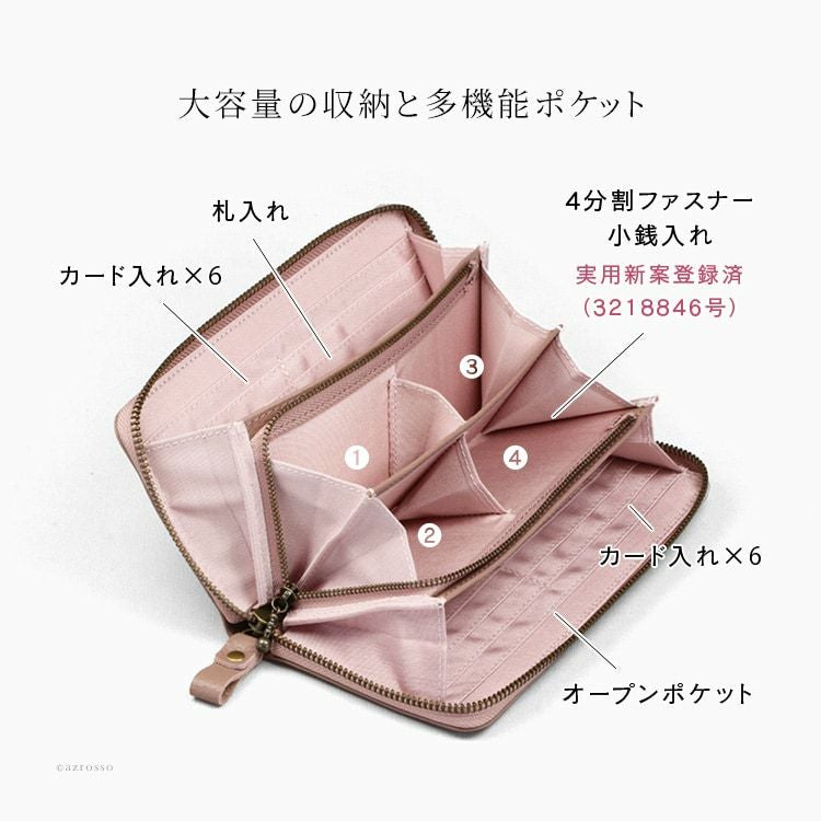 ・内装:札入れ×2、カード入れ×12、ファスナー式小銭入れ(内側4室)×1、オープンポケット×2