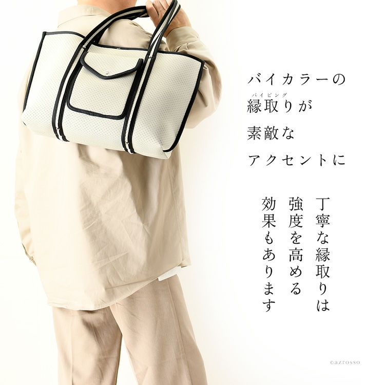 夏のカジュアルコーデに似合う爽やかなパンチングトートバッグがmadras(マドラス)から登場。大容量にもコンパクトにも使える2wayデザイン。汚れ・水に強いウェットスーツ素材の超軽量バッグ ネオプレン トートバッグ 超軽量 A4 大容量 2way 洗える パンチング madras MODELLO マドラス モデロ