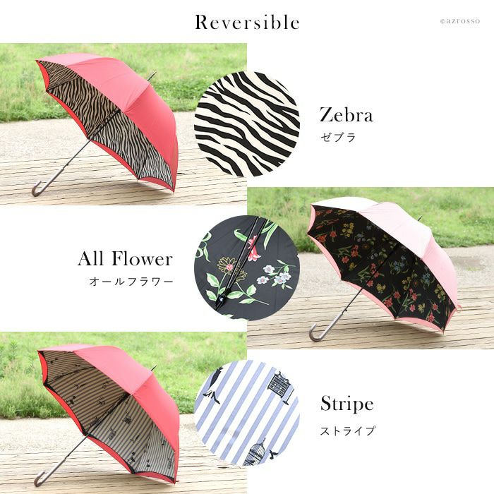 二重張りの柄がおしゃれなワンタッチジャンプ傘。UVカット率99%以上で日傘としても使える優れもの。クールでかっこいい大人女性の為の傘ブランド Lluvia rain (ルビアレイン)/ リバーシブル 雨傘 二重張り 長傘 晴雨兼用 傘 レディース 大判 ジャンプ ゼブラ フラワー 花柄 ストライプ レッド 赤 ピンク