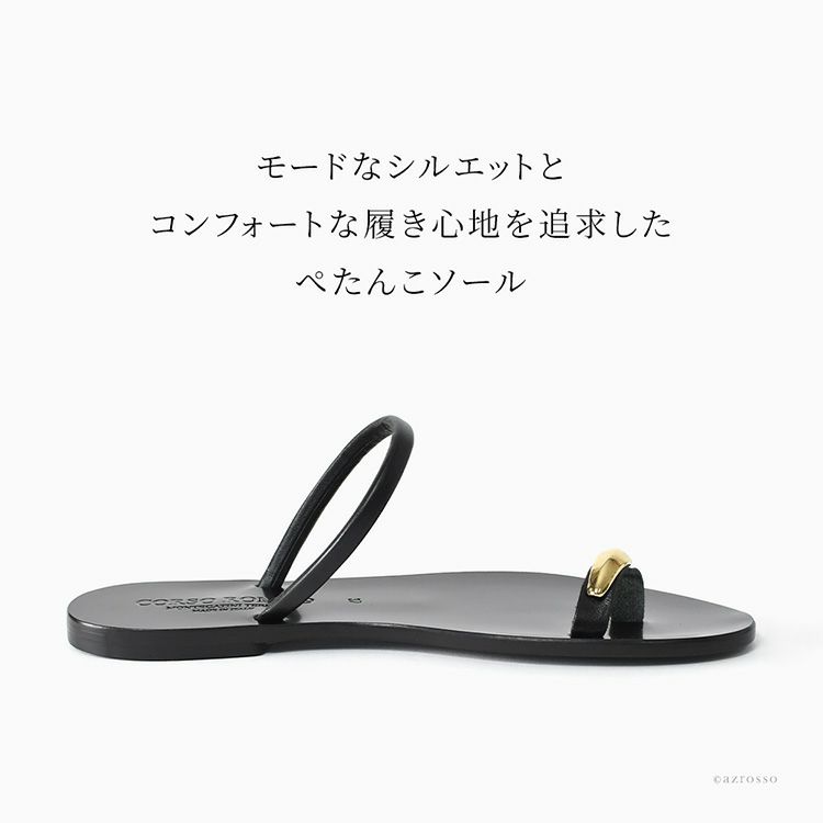 輝くゴールドのサムリングとストラップにブラックのレザーが夏の足元を美しく彩る、CORSOROMA9のイタリア製本革トングサンダル。フラットヒールで抜け感たっぷりの親指リングサンダルは、コーデ問わず履きやすい イタリア製 サムリングサンダル レディース ゴールドストラップ ブラック 親指 リング 軽量 夏 フラットサンダル 本革 つっかけ トングサンダル