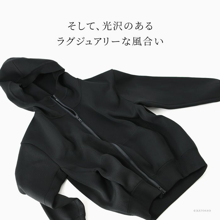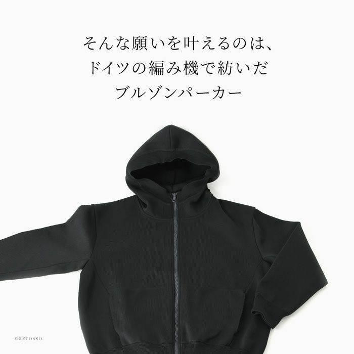 光沢感のあるニット素材の大きめブルゾン。ハイブランドも手掛ける日本メーカーによるストレッチ性、保温性高いブルゾンジャケット。フード付き。両開きファスナー ミラノリブ ブルゾン ジャケット レディース 大きめ マウンテンパーカー 秋 ジップアップ パーカー フード付き ビッグシルエット グレー ネイビー ブラック オーバーサイズ ストレッチ 日本製 ブランド 30代 40代 50代 ノアフ noaf