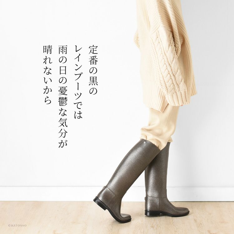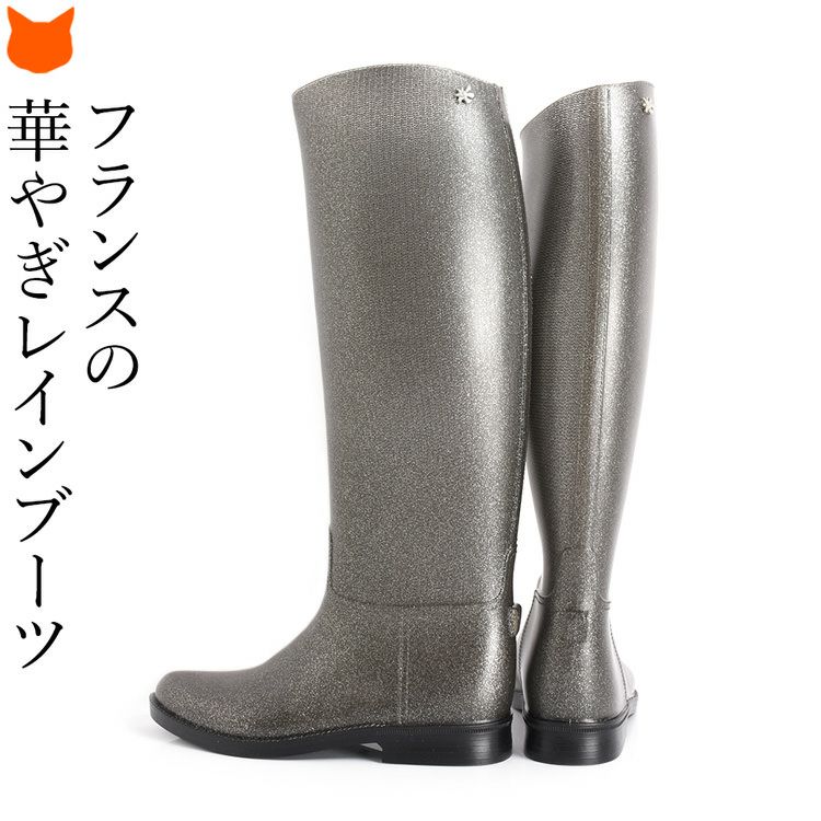 雨の日のコーデを軽やかに華やかに仕上げるレインブーツをフランスブランド meduse(メデュース)から。通勤などきれいめコーデに馴染むデザイン、パンツにもスカートにも合わせやすいロング丈 24cm-25.5cm│ラメ レインブーツ ロングブーツ ローヒール 長靴 ロング丈 シルバー グレー フランス製 ブランド MEDUSE メデュース