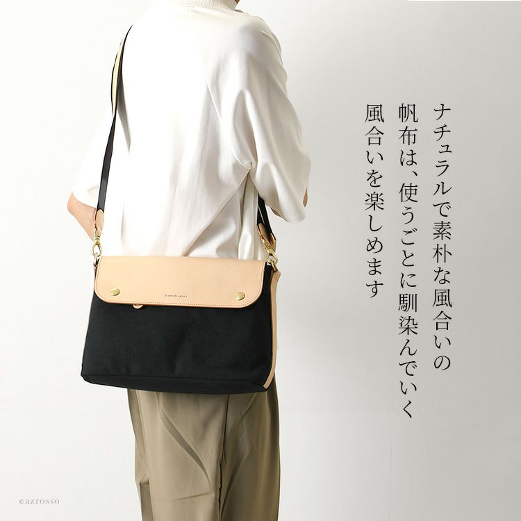 "ちょっとしたお出かけから旅行まで重宝するC'omodo+plust(コモドプラスト)のメンズショルダーバッグ。軽くて柔らい帆布に経年変化を楽しめるヌメ革をプラス した大人のカジュアルにぴったり" 本革×綿 メンズ ショルダーバッグ 斜めがけ レザー バッグ 横型 ポシェット 日本製 バッグ ブランド コモドプラスト C'omodo+plust ブラック レッド ベージュ カーキ