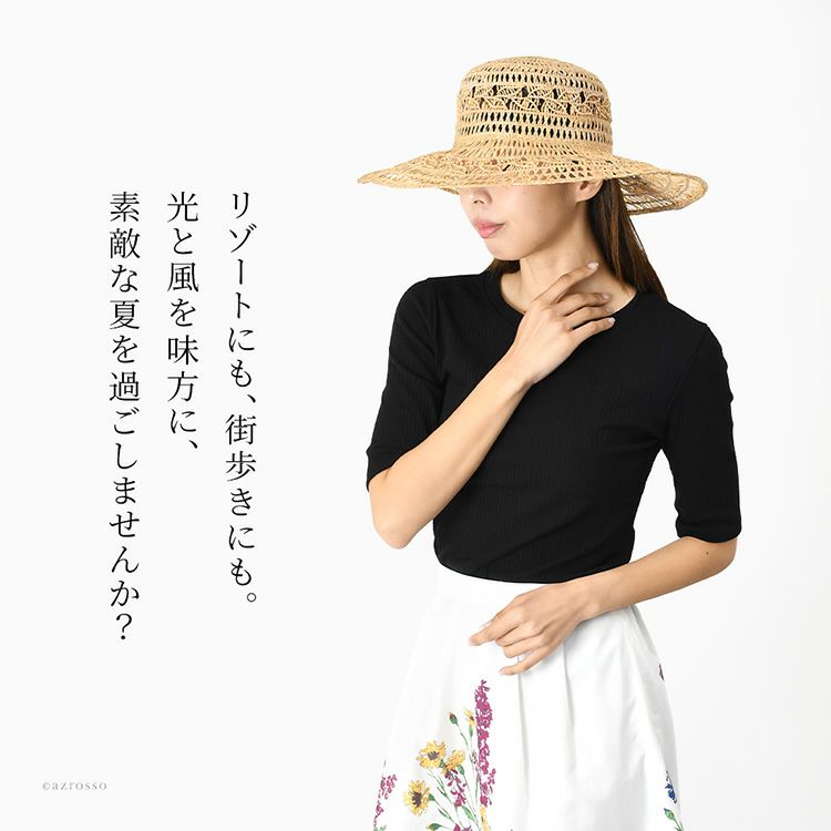 自然素材ラフィアを丁寧に編み上げた、ATELIER BRUGGEの夏帽子。涼しくておしゃれな麦わら帽子はつば広だから日よけ、UVカット効果も。リゾートにも街歩きにも映える、上質な夏のブランドハット。 日本製 ラフィア帽子 つば広 UVカット レディース 麦わら帽子 おしゃれで上品な夏用ハット ブランド アトリエブルージュ