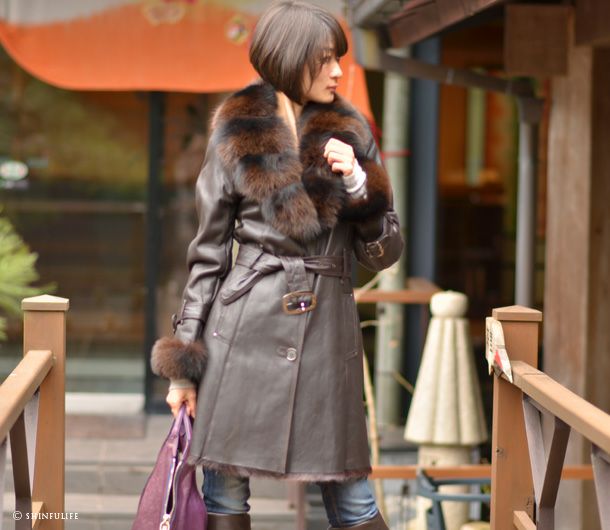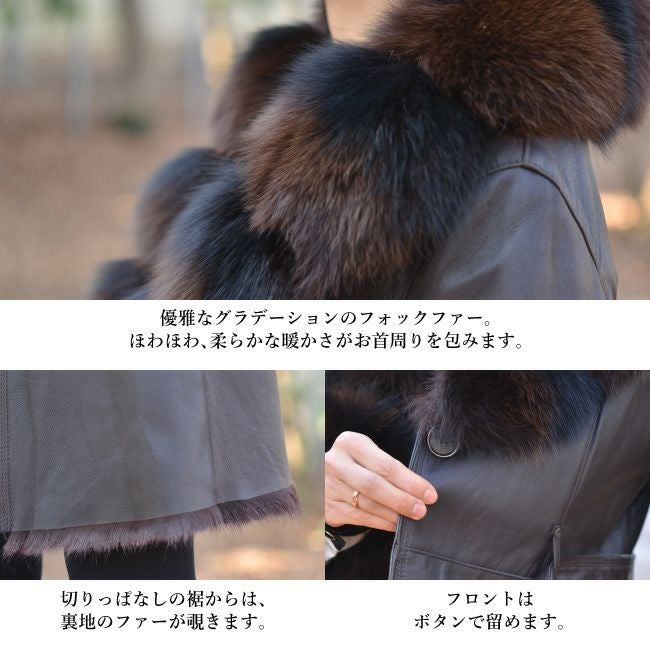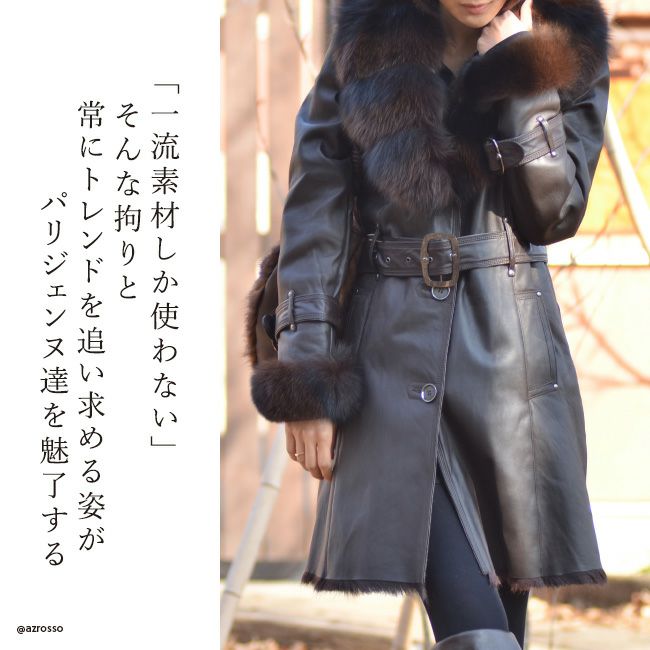 最高クラスのゴートレザー、Chevrette(シェブレット)で仕立てたロングコート 毛皮コート フランス製 フォックスファー ベルト付き
