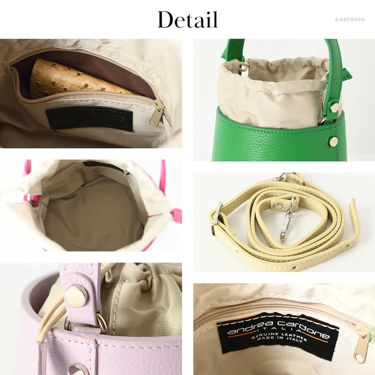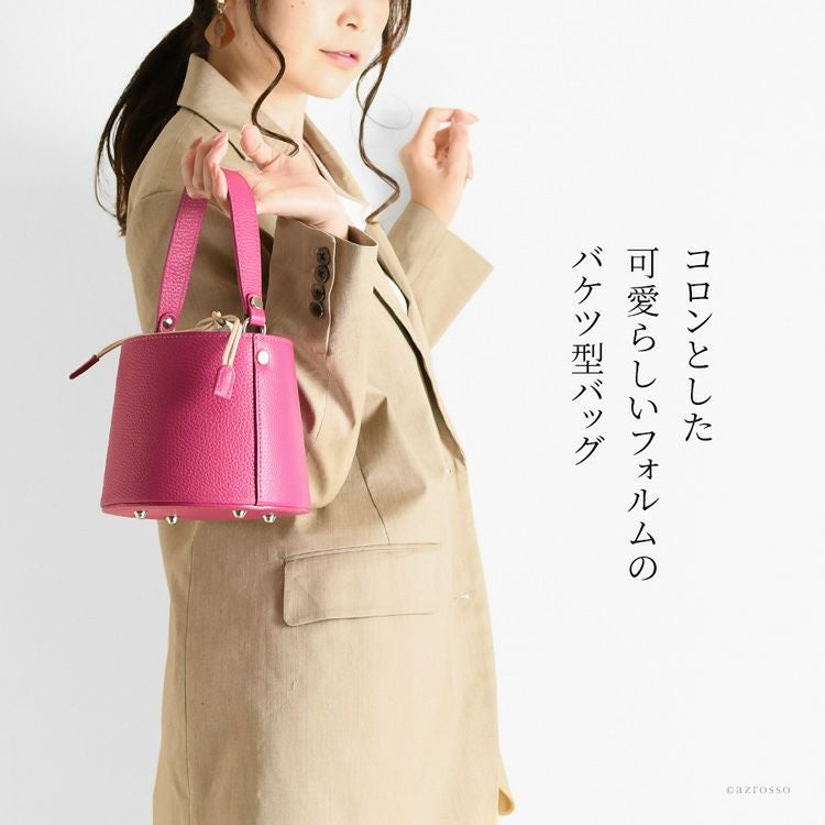 イタリアブランドらしい鮮やかなカラーがコーデに華やぎをもたらすアンドレアカルドネのミニバッグ。ショルダーストラップ付き2wayで、キレイめスタイルからカジュアルまで幅広くマッチ。 バケツバッグ 円筒バッグ 縦型 ハンドバッグ ミニバッグ イタリア製 レザー 2way ショルダーバッグ バケツ型 本革 肩掛け 斜めがけ ベージュ グリーン 緑 ピンク 底鋲付き 自立