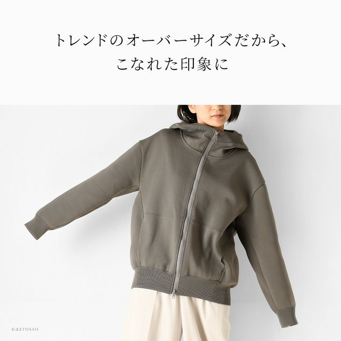 光沢感のあるニット素材の大きめブルゾン。ハイブランドも手掛ける日本メーカーによるストレッチ性、保温性高いブルゾンジャケット。フード付き。両開きファスナー ミラノリブ ブルゾン ジャケット レディース 大きめ マウンテンパーカー 秋 ジップアップ パーカー フード付き ビッグシルエット グレー ネイビー ブラック オーバーサイズ ストレッチ 日本製 ブランド 30代 40代 50代 ノアフ noaf