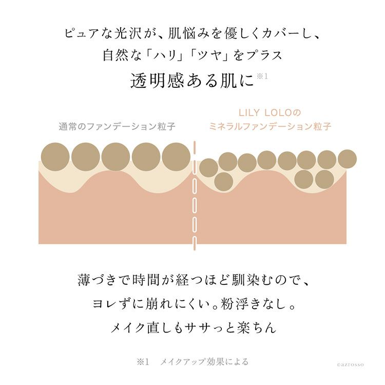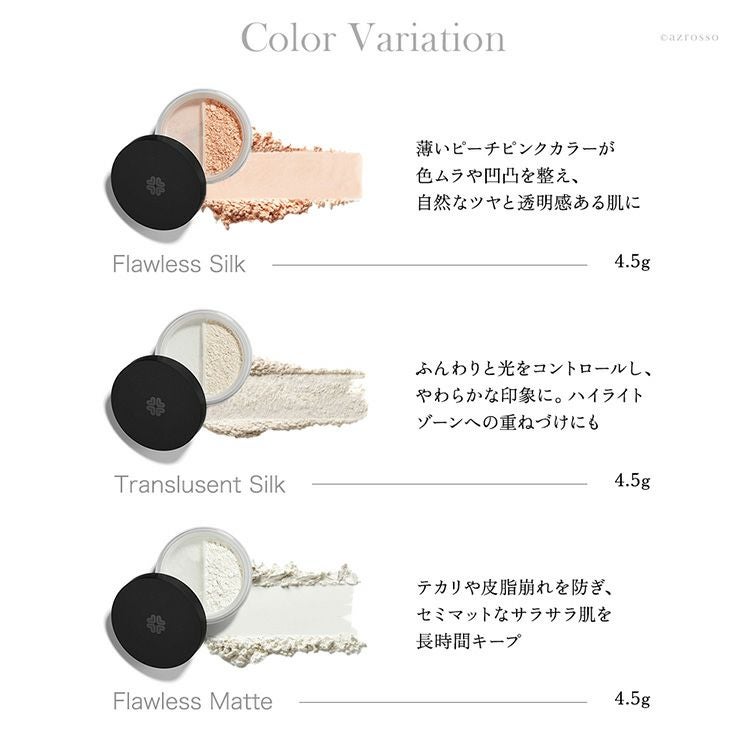 Flawless Silk(フローレスシルク)…マイカ [+/- CI 77491 (酸化鉄)、CI 77492 (酸化鉄)] - カオリン。ビーガンフレンドリー