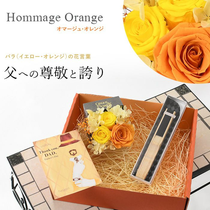 バラ(イエロー・オレンジ)の花言葉は「尊敬と誇り」。開けた瞬間に思わず元気になる太陽のような弾けるカラーがお父さんを驚きと喜びに導きます。