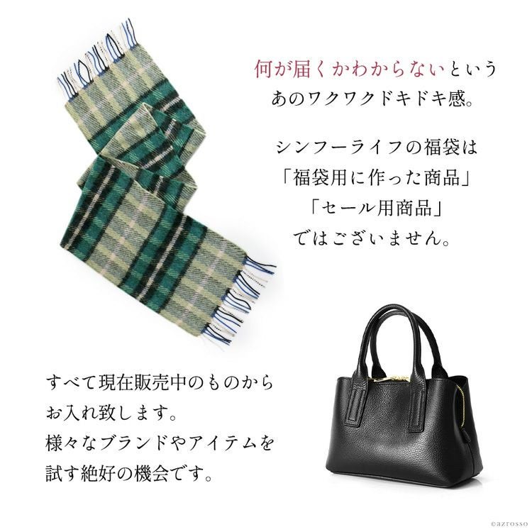 - シンフーライフで販売中のブランドのバッグ、マフラーやストールなどのファッション小物や雑貨、靴、アクセサリー(ピアス イヤリング ネックレス)が入ったファッション福袋。