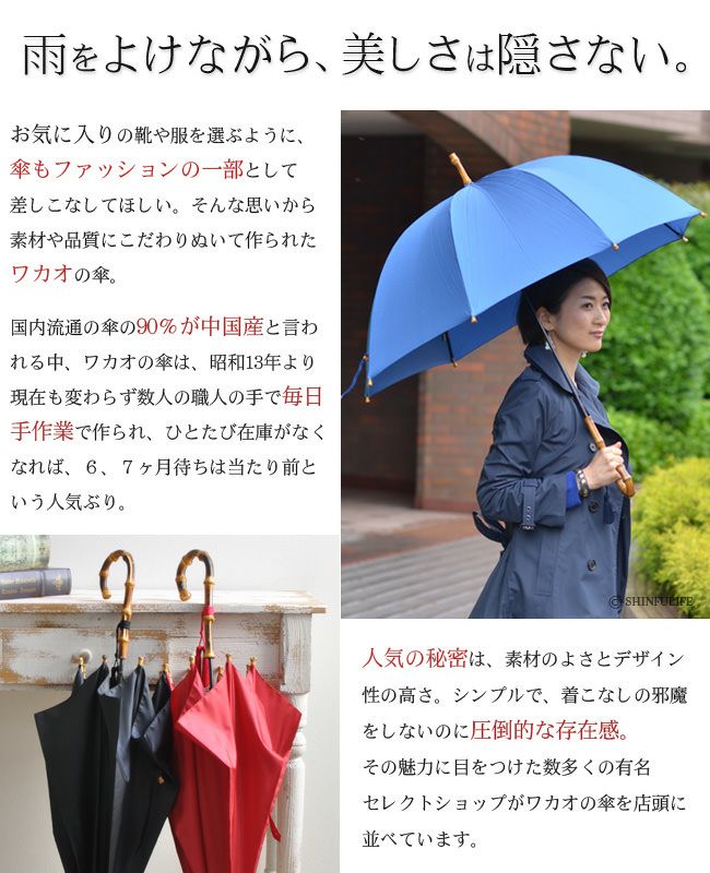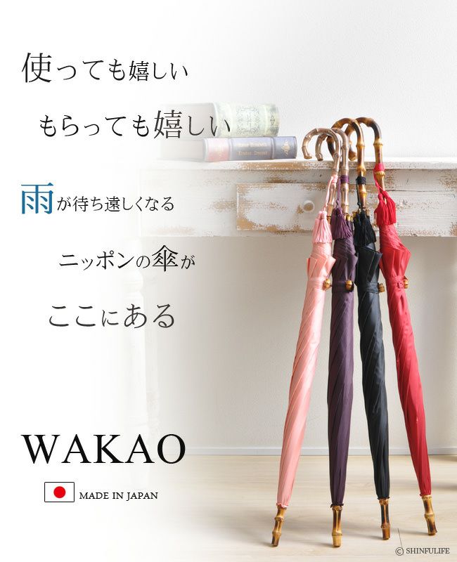 お気に入りの靴や服を選ぶように傘もファッションの一部として差しこなしてほしい。そんな思いから、素材や品質にこだわぬいて生まれたワカオの傘。国内流通の傘の90%が中国産と言われる中ワカオの傘は創業昭和13年より現在も変わらず数人の職人の手で毎日手作業で作られひとたび在庫がなくなれば、6ヶ月待ちは当たり前。お洒落な淑女を虜にする純日本製の傘はご自分でお使いになってもギフトとしても使う者に最高の満足感を与えてくれます。