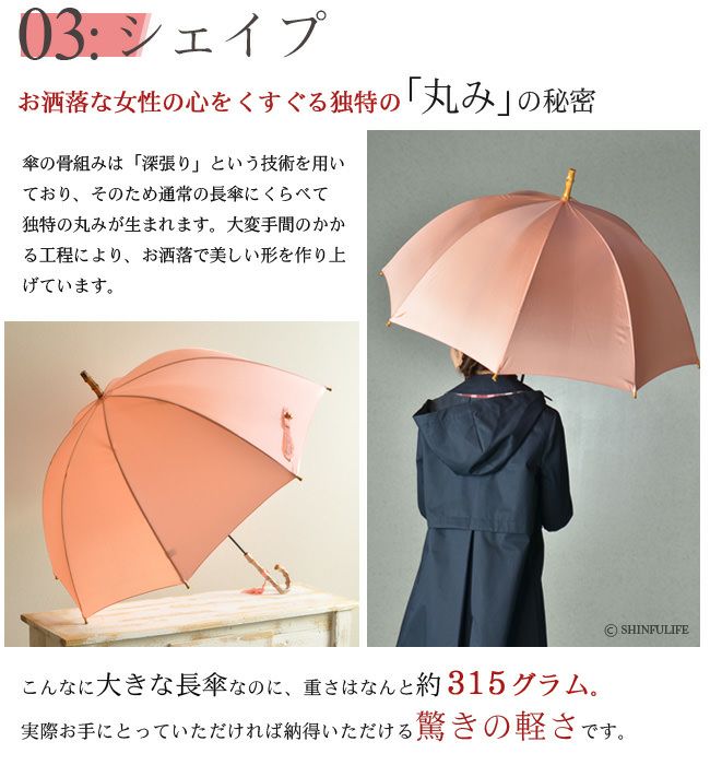 ●傘の骨組みは「深張り」という技術を用いており、そのため通常の長傘にくらべて