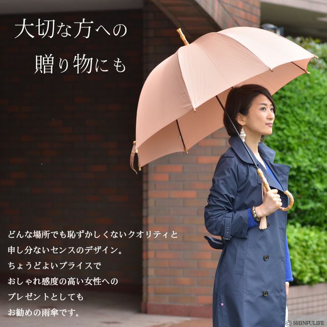 どんな場所でも恥ずかしくないクオリティと申し分ないセンスのデザイン。カジュアルから、フォーマルな着物、浴衣、和装にも。ちょうどよいプライスでおしゃれ感度の高い女性へのプレゼントとしてもお勧めの日本製の雨傘です。