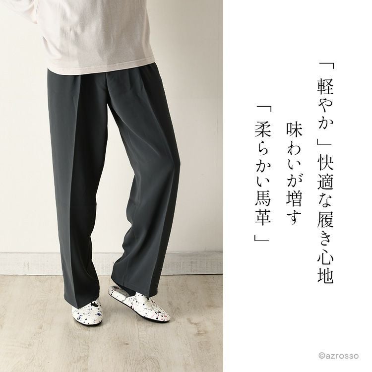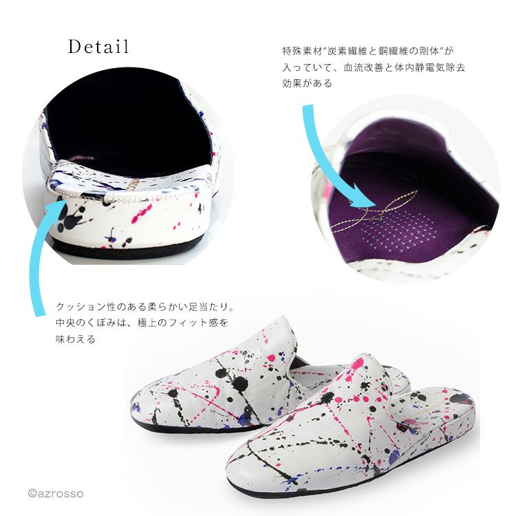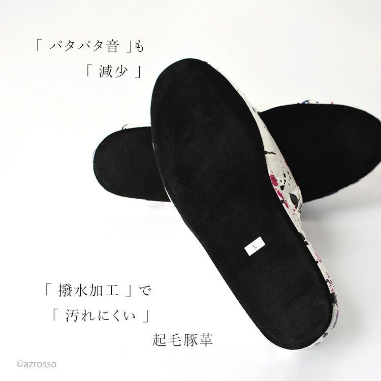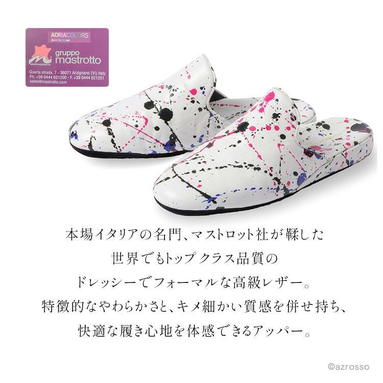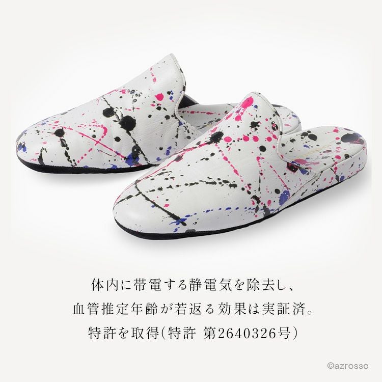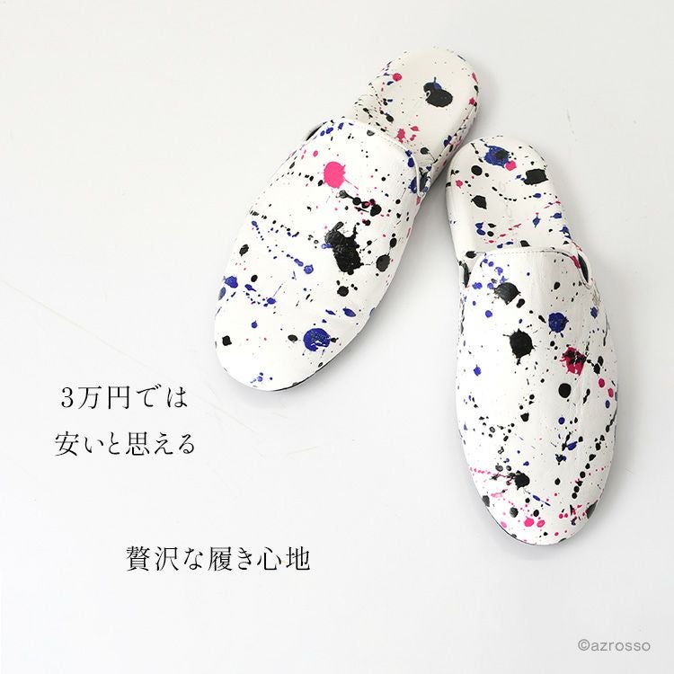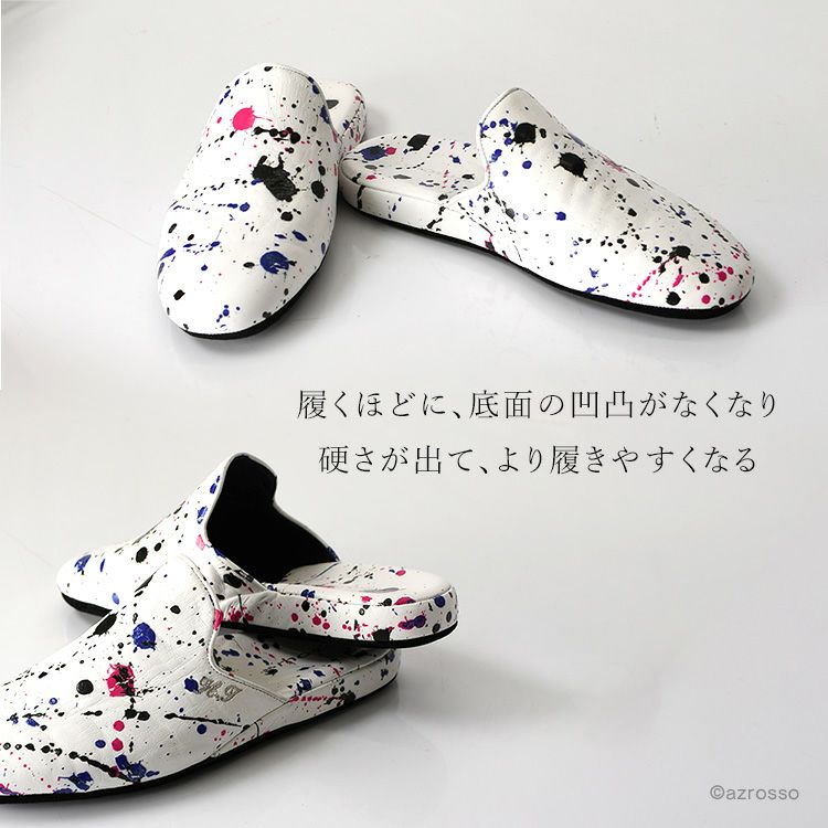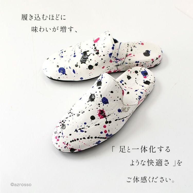 足と一体化するような快適な履き心地のSANAXの日本製レザースリッパ「moco NO.0888」。抗菌・防臭・除電効果あり。名入れ対応、ホワイトにペイントを施したおしゃれなメンズスリッパはプレゼントにもおすすめ 高級 スリッパ メンズ レザー ルームシューズ 名入れ 室内 靴 抗菌 本革 白 マルチ スプラッシュ柄 大きいサイズ 室内履き 日本製