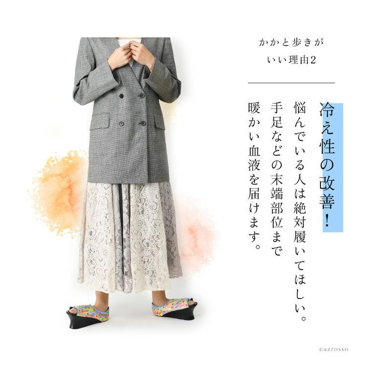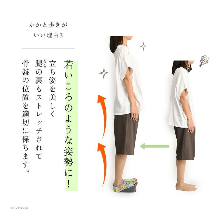 「足の裏や背筋など日ごろ使っていない筋肉の働きを取り戻す」このかかと歩きサンダルは、腰痛やひざの痛みに悩んでいた人にも好評です。お尻に重心がかかり姿勢を矯正しようとする無意識の力が各部を緊張させることの効果といいます。