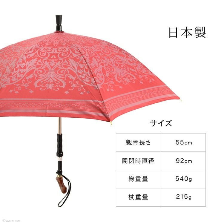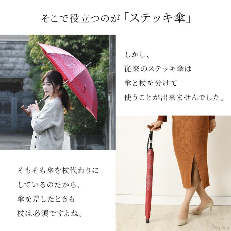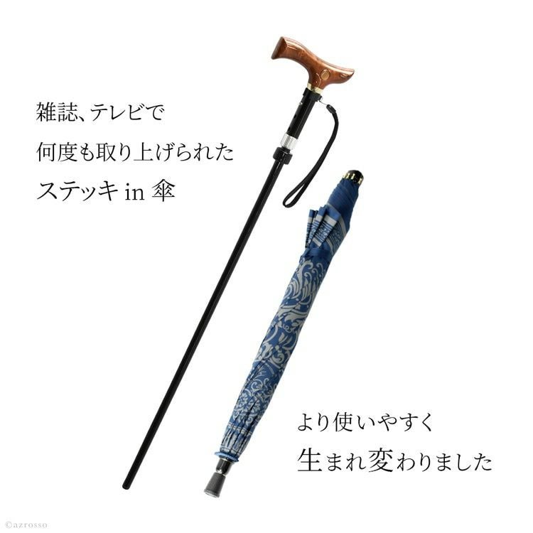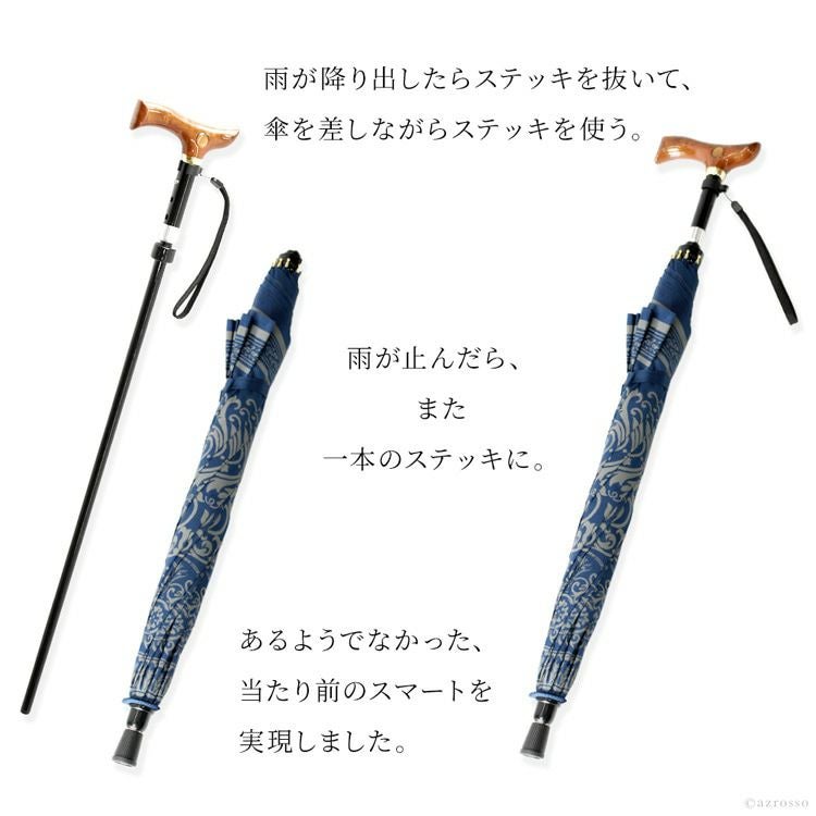 贈り物として人気のステッキインアンブレラ。杖と傘が一体化したスマートなアイテムです。傘は雨傘としても日傘としても使えて便利。軽い力で開閉できる桜骨&簡単マグネット式。