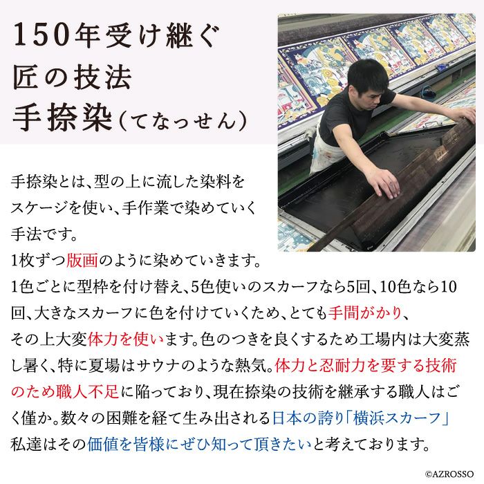 かつてシルク輸出国の世界トップとして名を馳せていた日本の横浜。懐かしい~と喜んでくれる70代のお母様もいらっしゃるはず。装いをエレガントにする上質スカーフは母の日プレゼントにうってつけの一枚です。