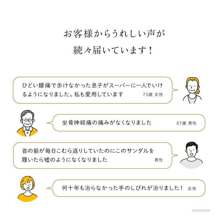 坐骨神経痛でしたが、このサンダルを履いてから痛みはなくなりました。もうつらいのは嫌なので毎日履いています