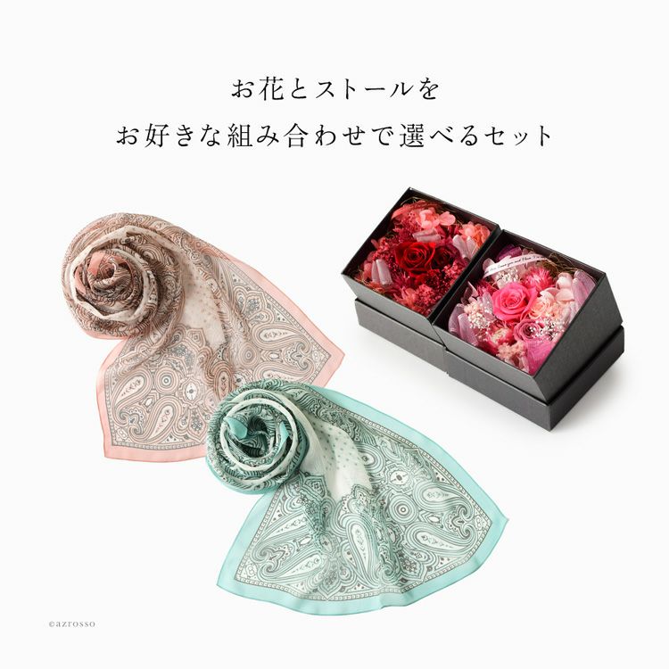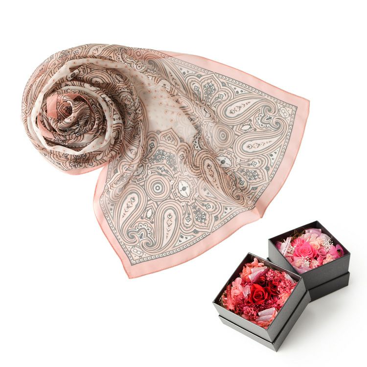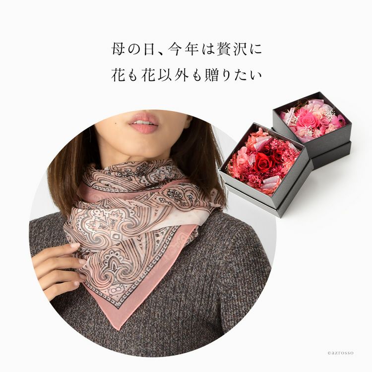 今年の母の日は贅沢に花も花以外も贈りませんか。お母さんを極上の笑顔へ導く、枯れないフラワーボックスとペルシャ柄・花柄から選べるシルクスカーフのギフトセット。メッセージカード、専用ラッピング付き 母の日ギフト スカーフ シルク100% 30cm×130cm 日本製 プリザーブドフラワー ドライフラワー ラッピング カード付き フラワーボックス