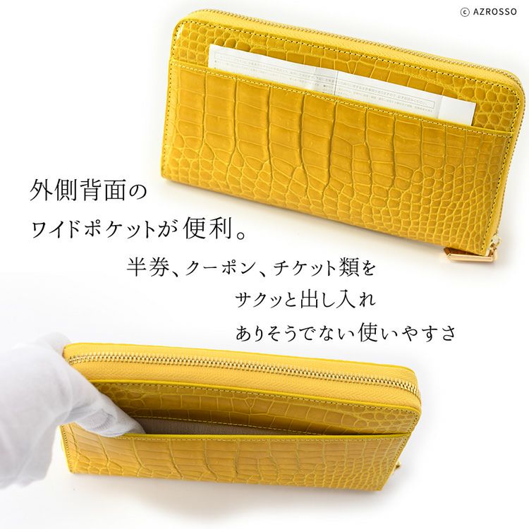 エナメル加工された美しいクロコダイルにゴールドの金具のお財布は、見た目にも華やかな雰囲気を演出。きれいめな輝きはやりすぎ感がなく、品格のある雰囲気が美しい。金運、運気がアップするカラー、グリーンとイエローの2色。