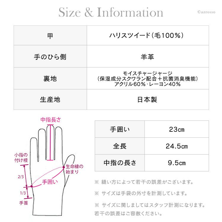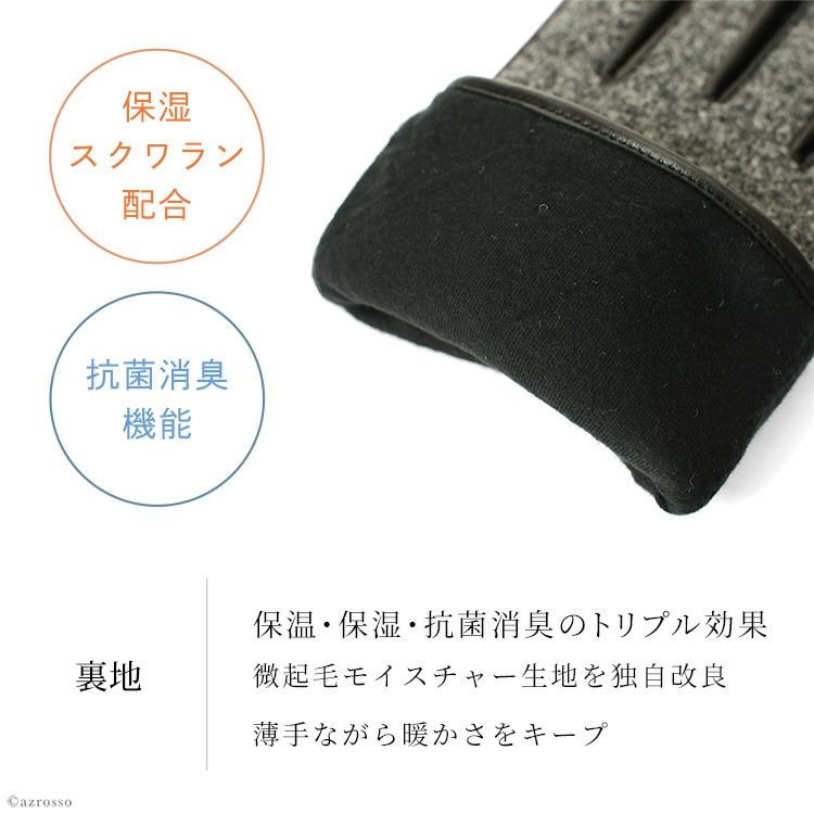 すっかり日本でも定着し、人気を博しているHarris Tweed(ハリスツイード)。保温性にも大変優れており、裏地のふわさら極薄ボアも合わさって、しっかりと手を温めてくれます。