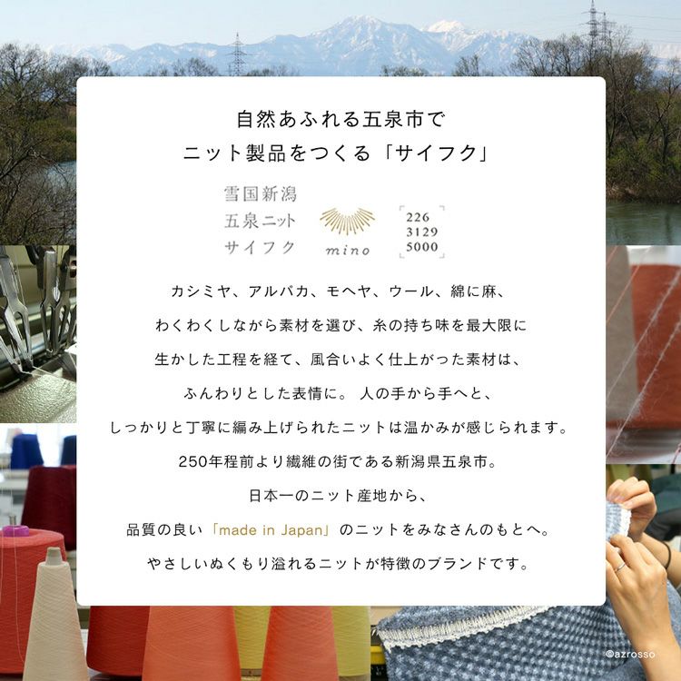 カシミヤ、アルパカ、モヘヤ、ウール、綿に麻、わくわくしながら素材を選び、糸の持ち味を最大限に生かした工程を経て、風合いよく仕上がった素材は、ふんわりとした表情に。 人の手から手へと、しっかりと丁寧に編み上げられたニットは温かみが感じられます。250年程前より繊維の街である新潟県五泉市。日本一のニット産地から、品質の良い「made in Japan」のニットをみなさんのもとへ。やさしいぬくもり溢れるニットが特徴のブランドです。