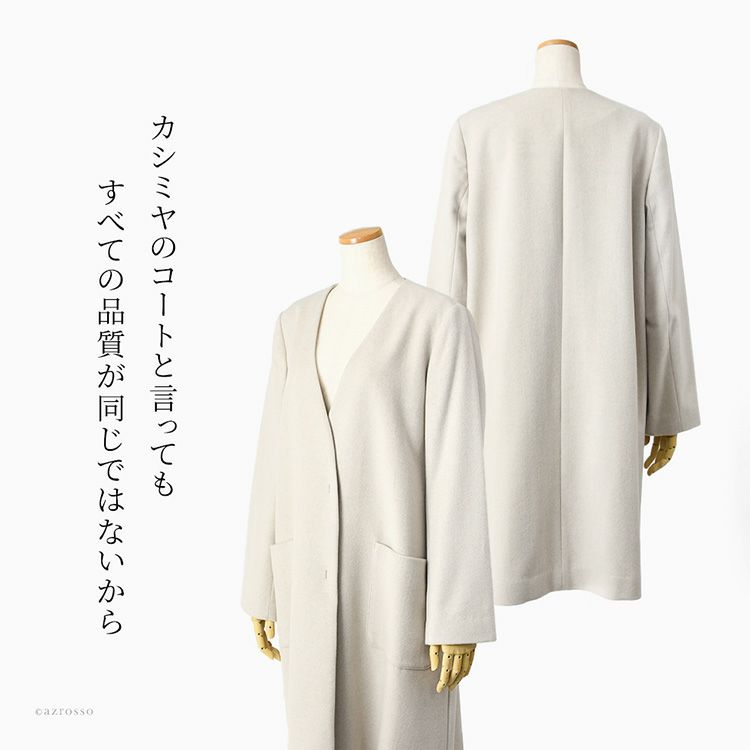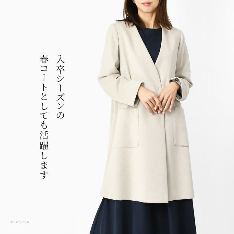 カシミヤとセーブルの上質素材で紡ぐ日本製ノーカラーコート。暖かく軽い着心地、秋から冬まで快適に過ごせるレディースコート。上品な雰囲気は春のセレモニー 入卒式 冠婚葬祭等のフォーマルシーンにも相応しい品格 日本製 カシミヤコート ノーカラーコート レディース 冬 ミドル丈 ブランド Vネック 軽い 暖かい フォーマル 入学式 卒業式 セレモニー 冠婚葬祭