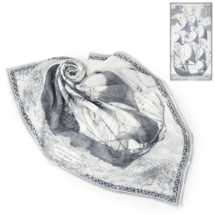 どう巻いても美しい、大海原へ進む帆船を描いたおしゃれな大判ストール。フランスブランドINOUI EDITIONS(イヌイエディションズ)の柔らかなコットン100%ストール コットン ストール 大判 薄手 レディース おしゃれ 帆船 柄 長方形 100×180 綿100 冷房対策 持ち運び フランス ブランド 母の日 プレゼント ギフト