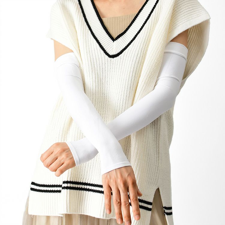 よくある生地のアームカバーだと、ずり落ちてきてしまうのとなんだかんだアームカバーつけると暑いので敬遠していましたが、数年前から季節の変わり目に日光蕁麻疹がでるようになってしまったためフィット感のありそうなこちらを購入しました。 生地の伸びがすごくよく、肩の付け根から、手の甲まで隠れます。そしてひんやりします。外すとミニマムで荷物にならないのもいいです。色違いで購入したくなりました。