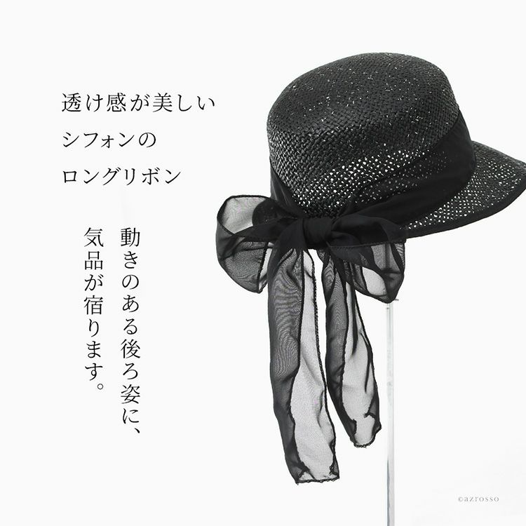 ラメ入り素材が上品にきらめく、イタリア製つば広麦わら帽子。ロングリボンが揺れる、大人の夏帽子。涼しくUVカット対策 マリーニシルヴァーノ イタリア製 麦わら帽子 ブラック つば広 リボン UVカット レディース帽子