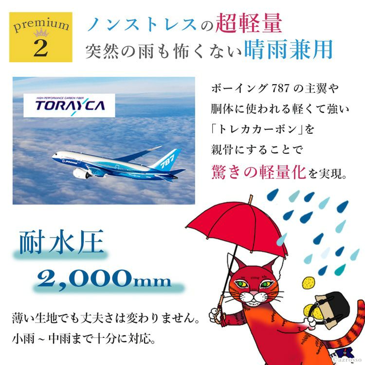ゲリラ豪雨にも耐えられるほど雨に対する強度があります。親骨にはボーイング飛行機に使用するカーボンファイバーを使用し、さらなる軽量化も実現。