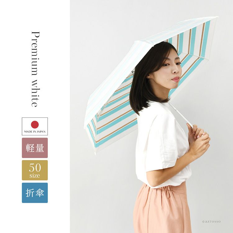 UVカット率99%以上の白い日傘。温度カット10℃以上のひんやり涼しいUVION Premium white(ユビオン プレミアムホワイト)。幾何学模様のような洗練されたベルト柄の折り畳み傘は母の日ギフトにもおすすめ 白 日傘 折りたたみ 晴雨兼用 軽量 グラスファイバー 親骨50cm 丈夫 uvカット99% 遮熱 内側に柄 タッセルベルト ひんやり 日本製 ブランド UVION ユビオン プレミアムホワイト レディース