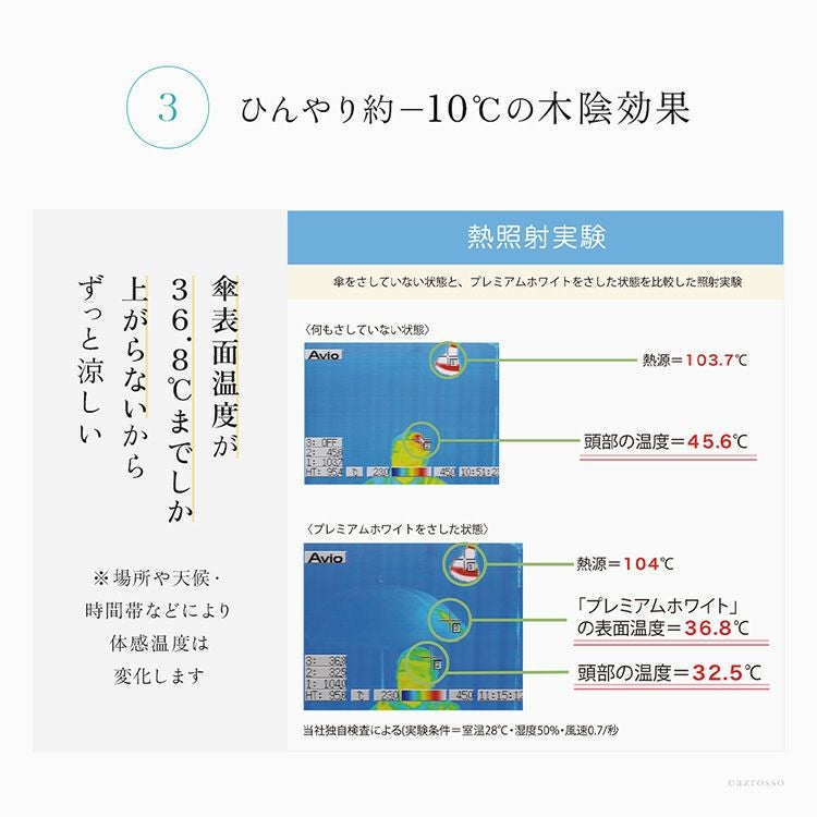 プレミアムホワイトは、ホワイトカラーであるにもかかわらず、紫外線は99%以上、赤外線も98.5%以上カット、傘の内部温度を約10℃も下げてくれる画期的な日傘です。