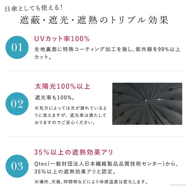 ※UVブラックコーティング生地につきまして、Qtec(キューテック)《(財)日本繊維製品品質技術センター》による検査の結果、 未加工生地を使用した当社製品との比較で35%以上の遮熱効果が認められました。