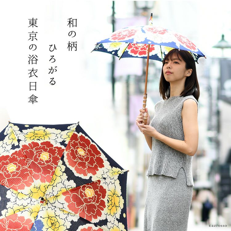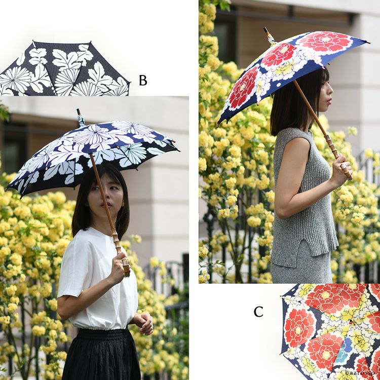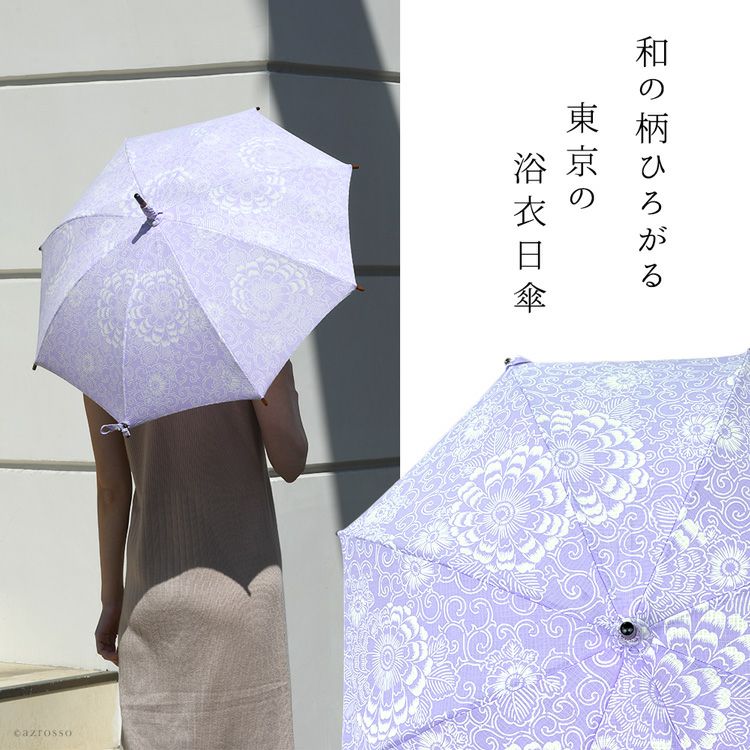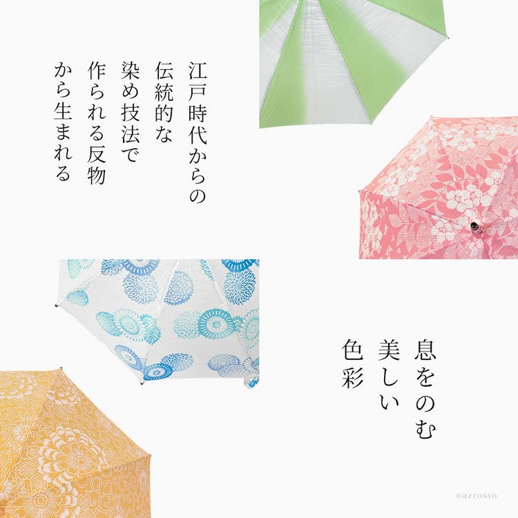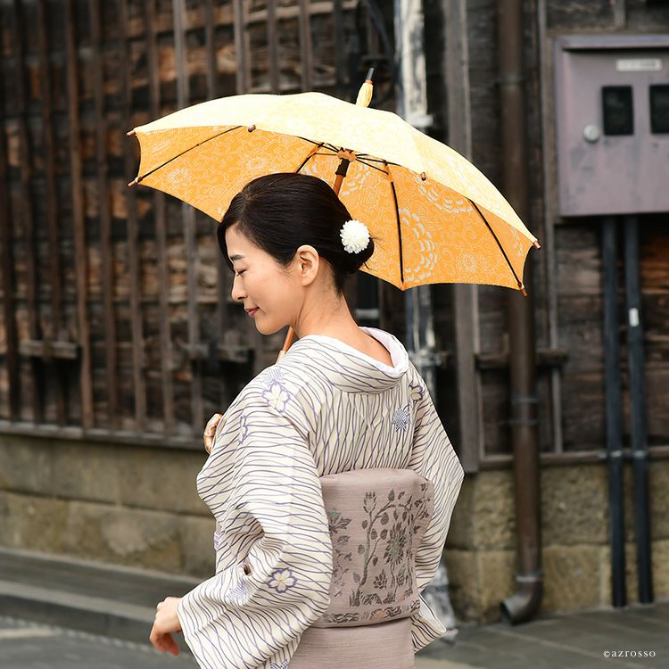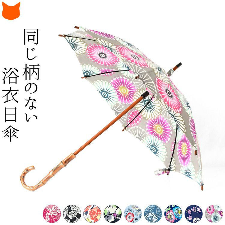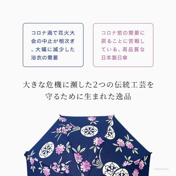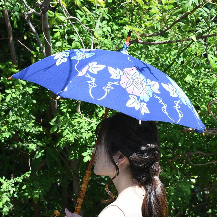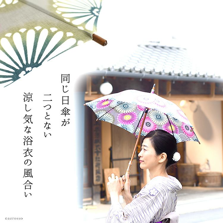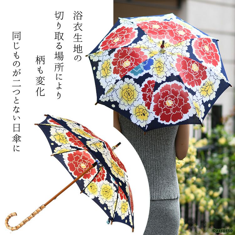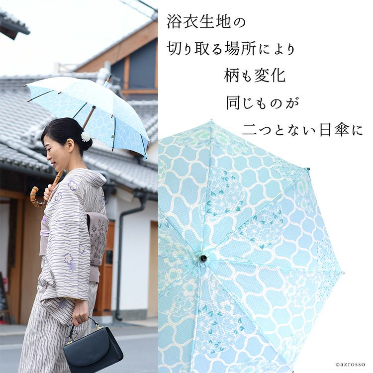 国産傘ワカオ(WAKAO)×日本橋の反物メーカーがコラボ。すべてが1点もののおしゃれな浴衣日傘。着物や和装に似合う大人の夏の日傘 ワカオ 日傘 長傘 日本製 浴衣生地の日傘 WAKAO 三勝染め バンブーハンドル 寒竹 WAKAO