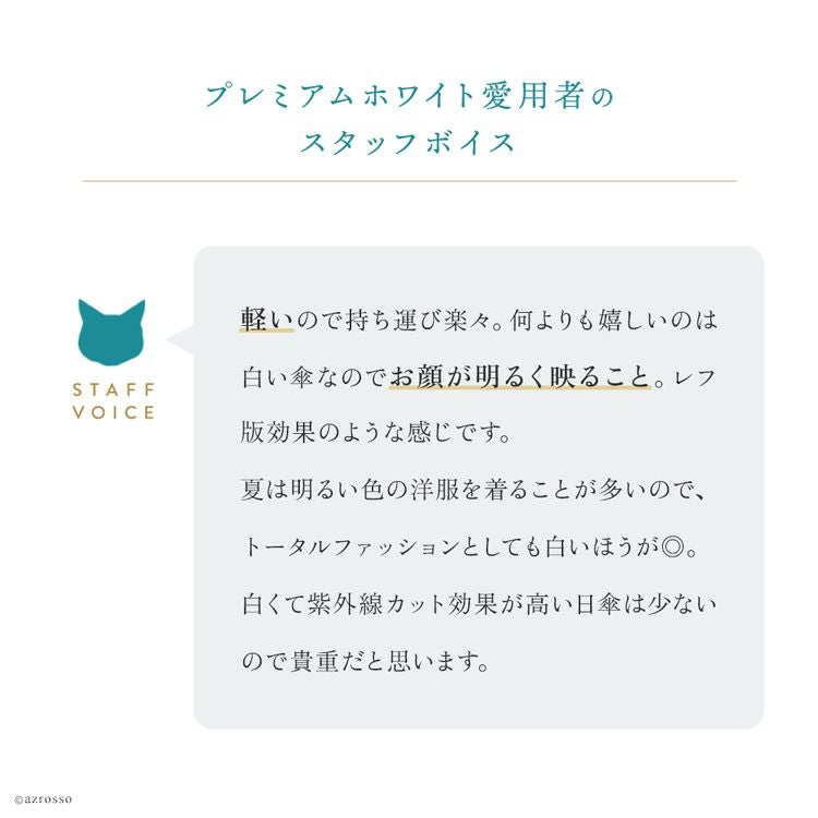 プレミアムホワイトは、ホワイトカラーであるにもかかわらず、紫外線は99%以上、赤外線も98.5%以上カット、傘の内部温度を約10℃も下げてくれる画期的な日傘です。