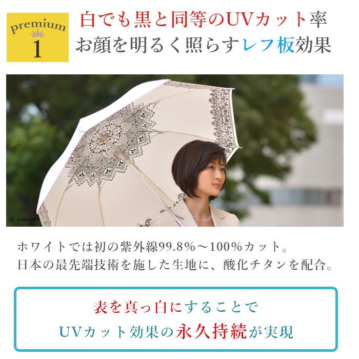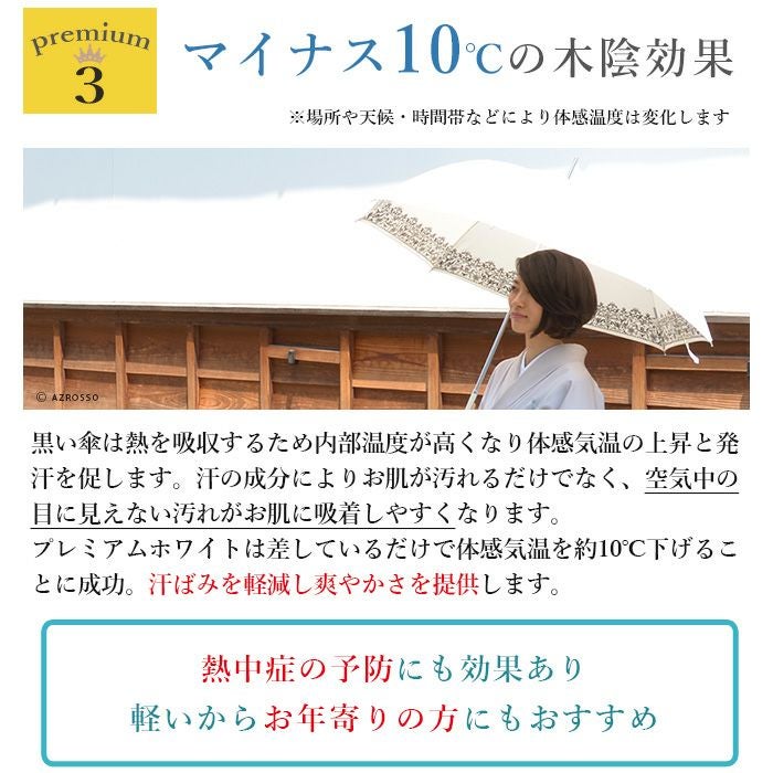 UVカット率ほぼ100%、晴雨兼用+遮熱でひんやりクールダウン効果あり。完全遮光や1級遮光と違い瞳に安全な日傘 大判 日傘 レース柄 ユビオン プレミアムホワイト 日本製 8本骨 白でもUVカット99% 驚きの殺菌力と抗菌力をもつ日傘|3283