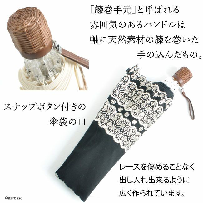 スナップボタン付きの傘袋は、口が広く作られていますのでレースを傷めることなく出し入れができます。