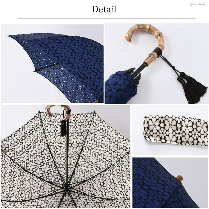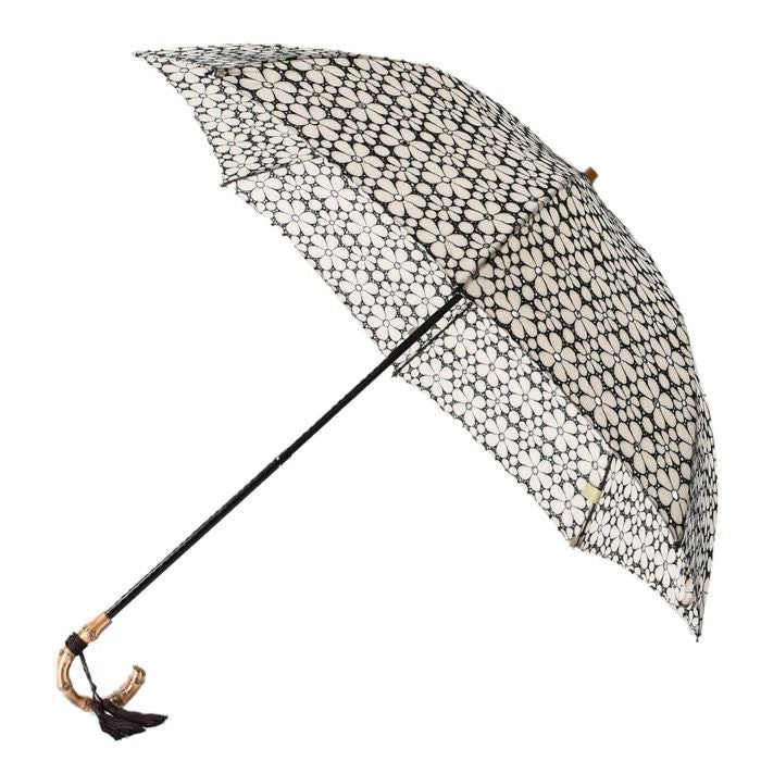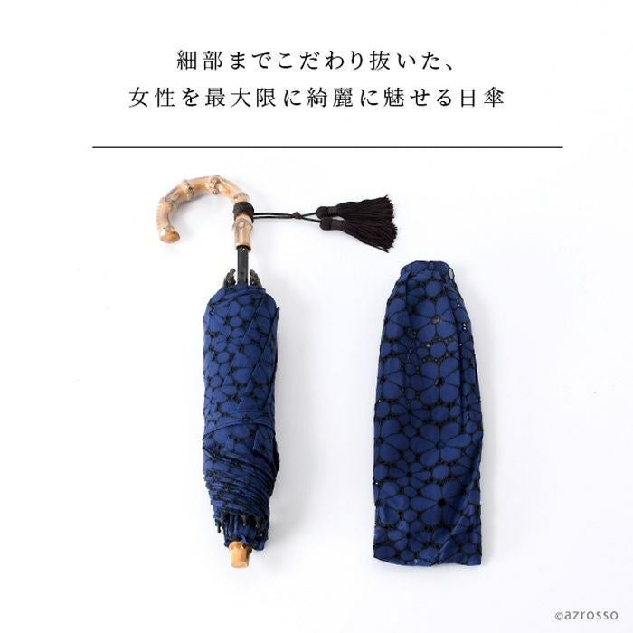 フラワーレースの刺繍と上品な透け感がアクセント。東京老舗の傘工房ワカオの布製折りたたみ日傘 和装にも似合う高級感 ワカオ 日傘 折りたたみ レース刺繍 日本製 WAKAO コットン 綿100 バンブーハンドル タッセル 寒竹
